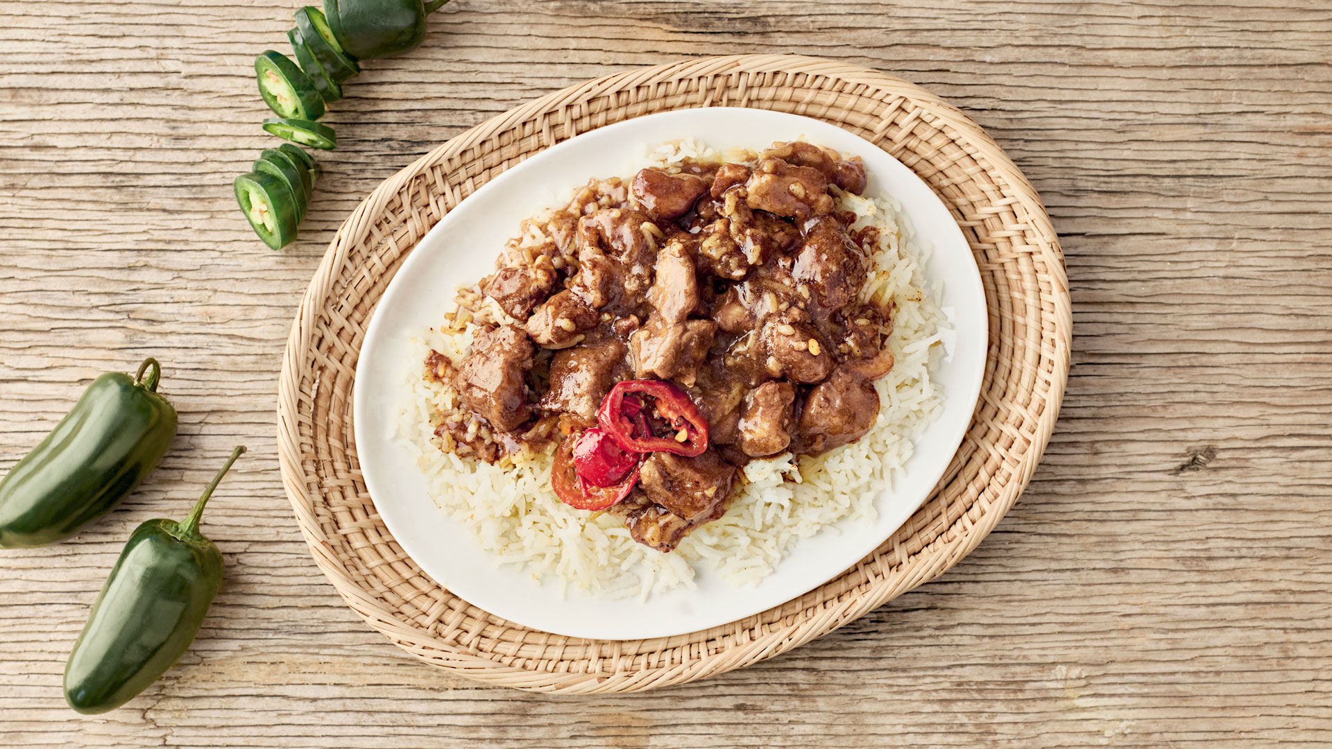 Pehmeän basmatiriisin päällä lepää hennosti chilillä viimeisteltyä possua, joka saa makunystyrät heräämään, mutta ei polta liikaa. Täydellinen yhdistelmä kotimaisuutta ja kaukomaiden mausteisuutta.