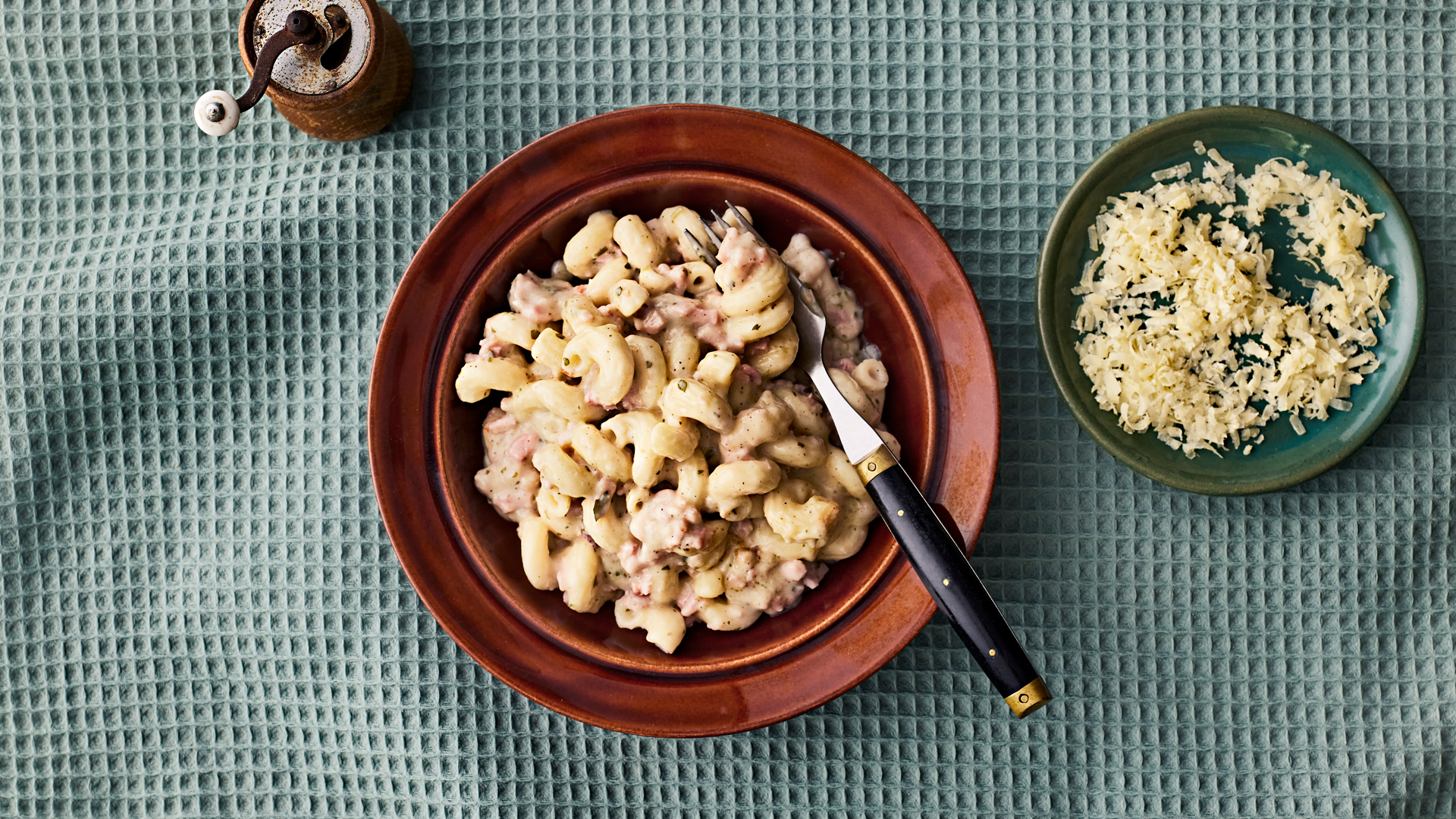 Klassikko leivän päällä, miksei pastassakin? Siispä otettiin reilusti Snellmanin hyvää kinkkua ja sulateltiin mukaan Valio juustoja, cheddaria ja mozzarellaa. Ja kyllähän se toimii.