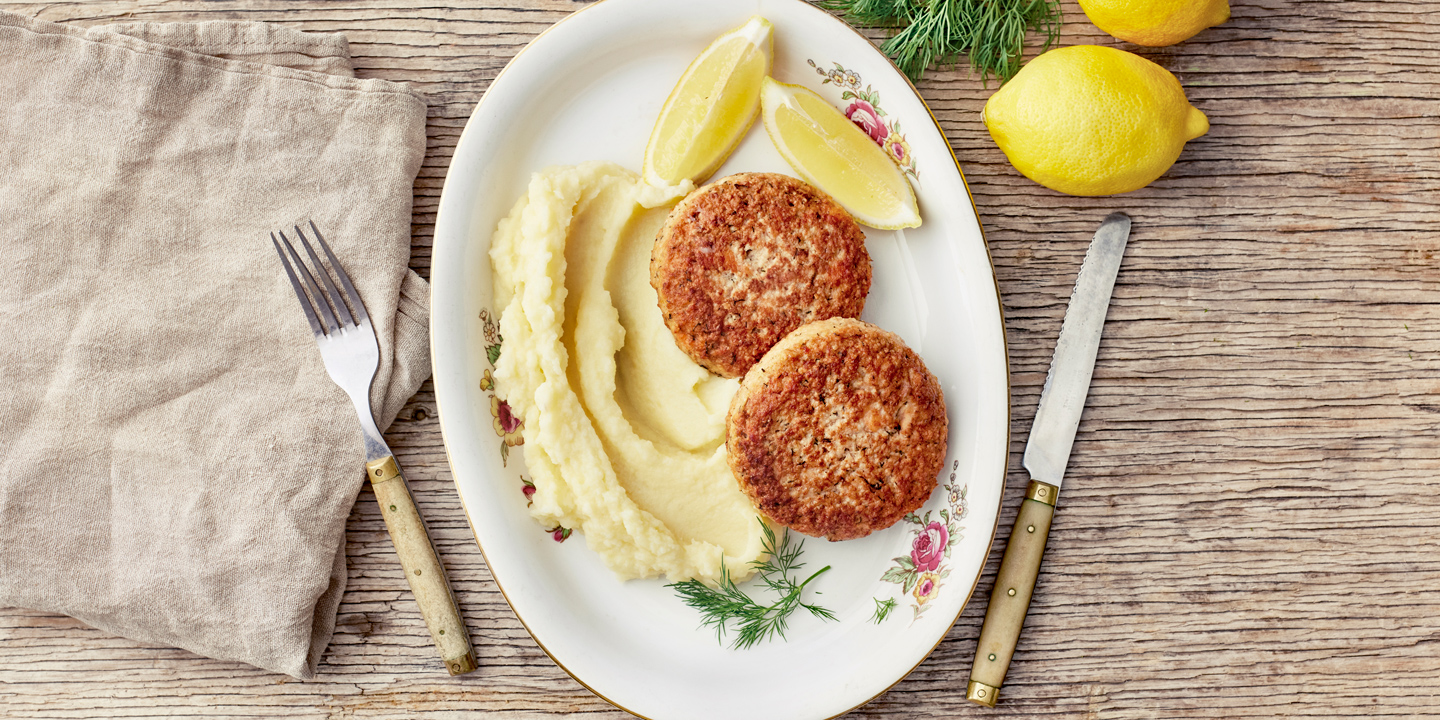Maukas kirjolohesta ja Norjan lohesta valmistettu 100g painava kalamurekepihvi on maustettu sipulilla, tillillä, suolalla ja valkopippurilla.