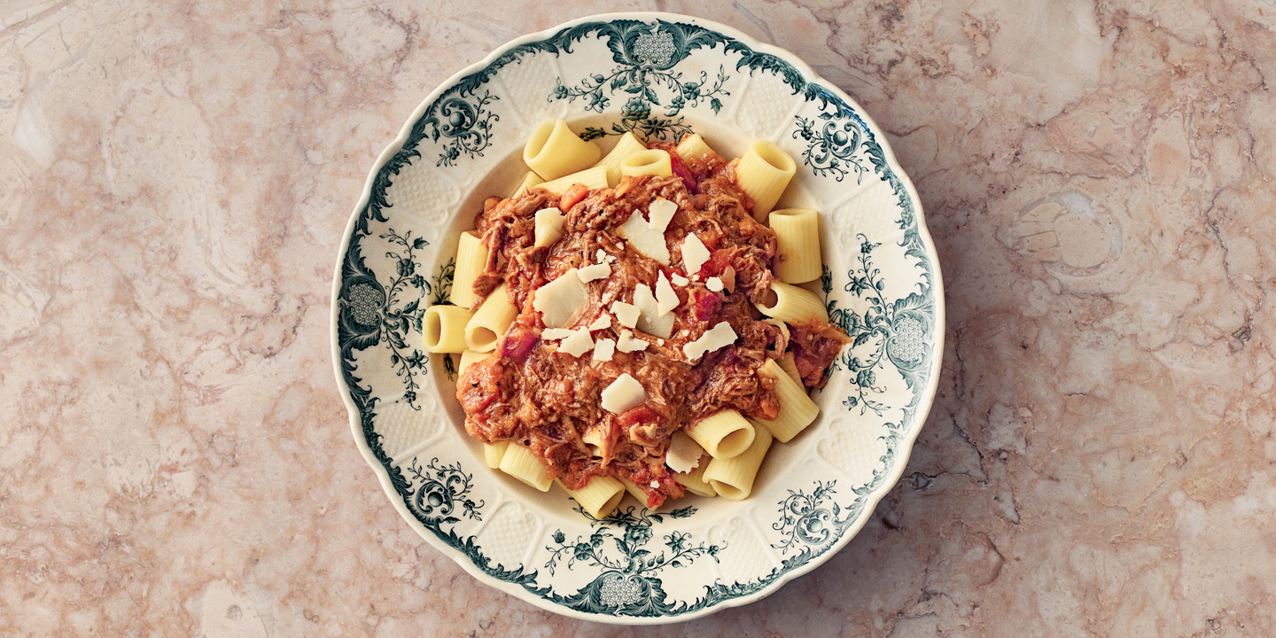 Tässä annoksessa kastiketta on yli puolet. Täyteläistä nyhtönautaa ja tuoreita kasviksia pitkään haudutettuna. Päällä on parmesaanilastuja – ihan aitoja. Todella toimiva ja herkullinen annos, jollaista harvemmin kotona tulee tehtyä.