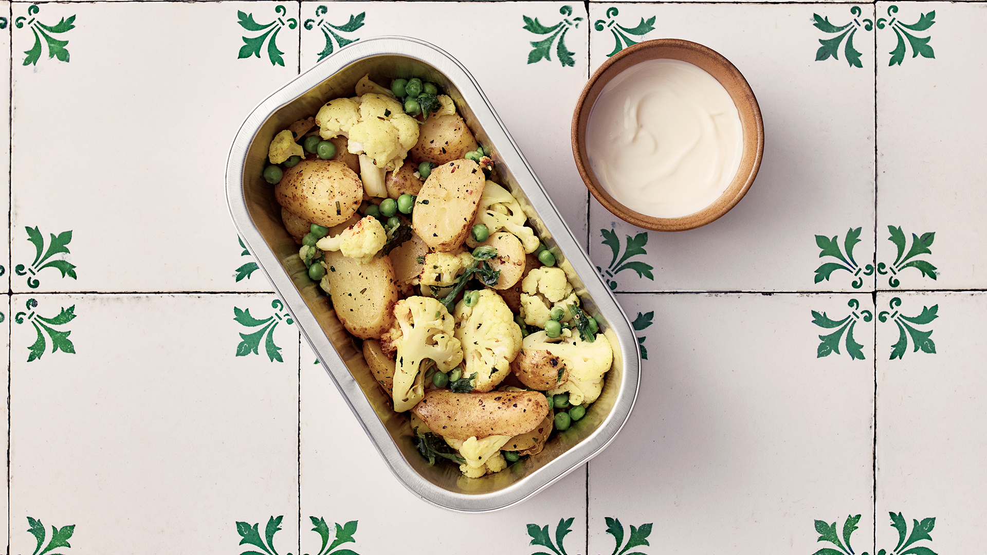 Perunat 225 g: Peruna 97 % (Suomi), rapsiöljy, jodioitu suola, valkosipuli, mustapippuri, sitruunankuori, timjami, rosmariini, kurkuma. Kukkakaali-kasvissekoitus 155 g: Kukkakaali 84 % (EU), herne, pinaatti, rapsiöljy, jodioitu suola, valkosipuli, sitruunankuori, rosmariini, timjami, kurkuma. Lime-jogurttikastike 40 g: Jogurtti (maito, kerma, maitojauhe, hapate) (Suomi), limen mehu, sokeri, jodioitu suola, säilöntäaine (E202).
